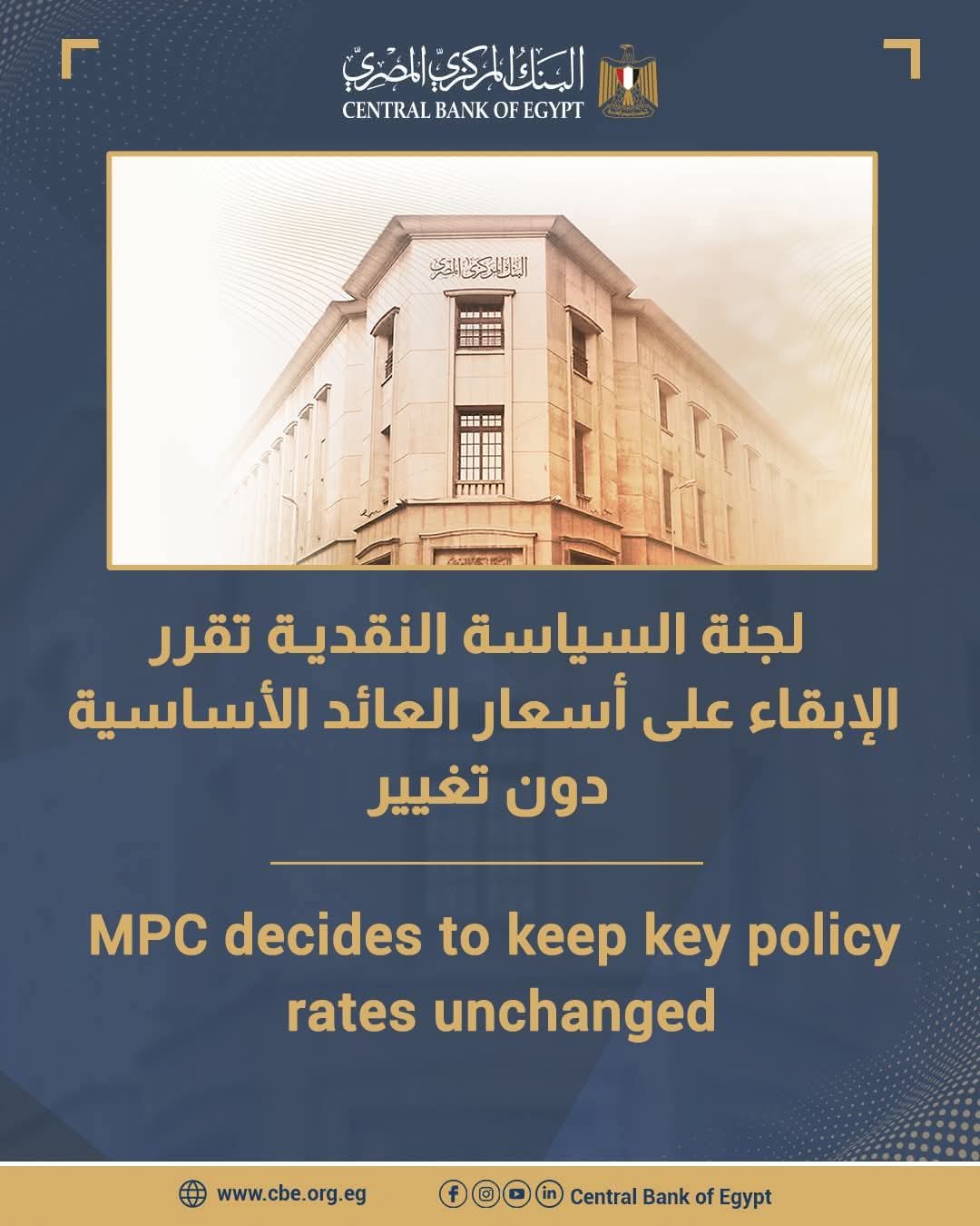 قررت لجنة السياسة النقدية للبنك المركزي المصري في اجتماعها يوم الخميس الموافق 2 إبريل 2026 الإبقاء على أسعار العائد الأساسية دون تغيير.