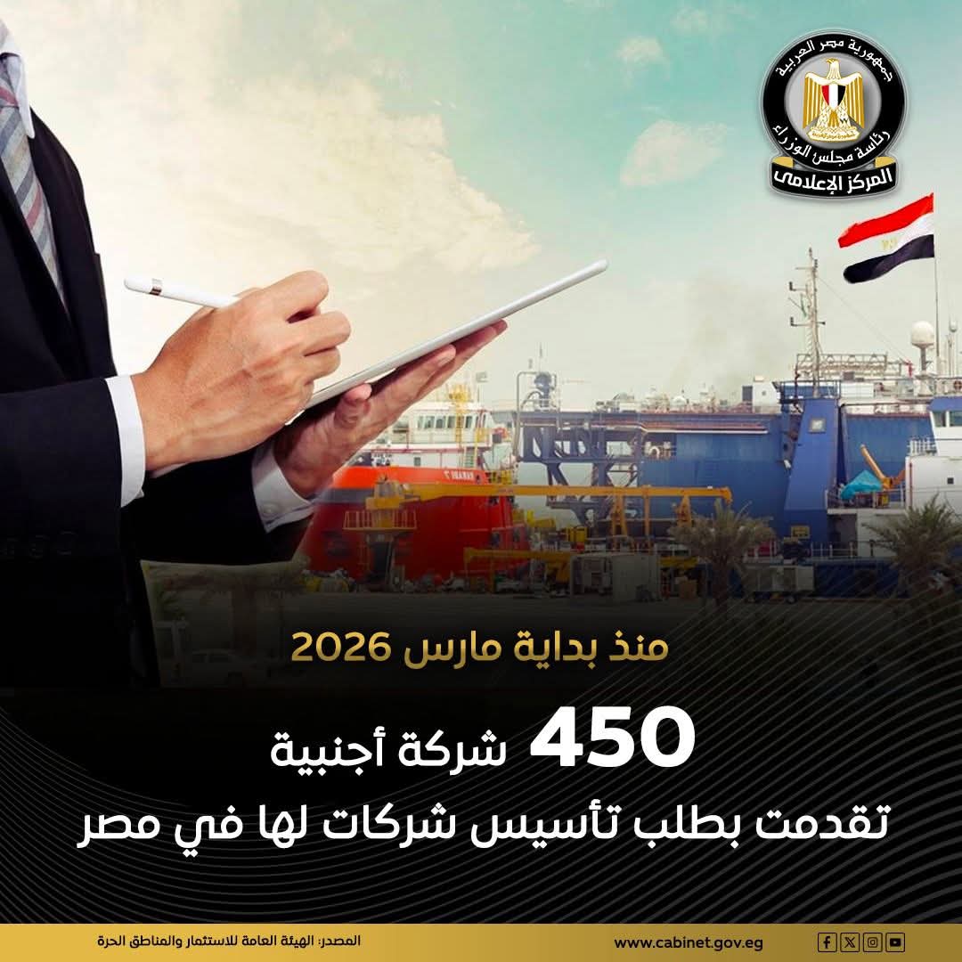 أعلن المركز الإعلامي التابع لمجلس الوزراء عند تقدم 450 شركة أجنبية بطلب تأسيس شركات لها في مصر منذ بداية مارس 2026، بالرغم من التوترات الإقليمية.