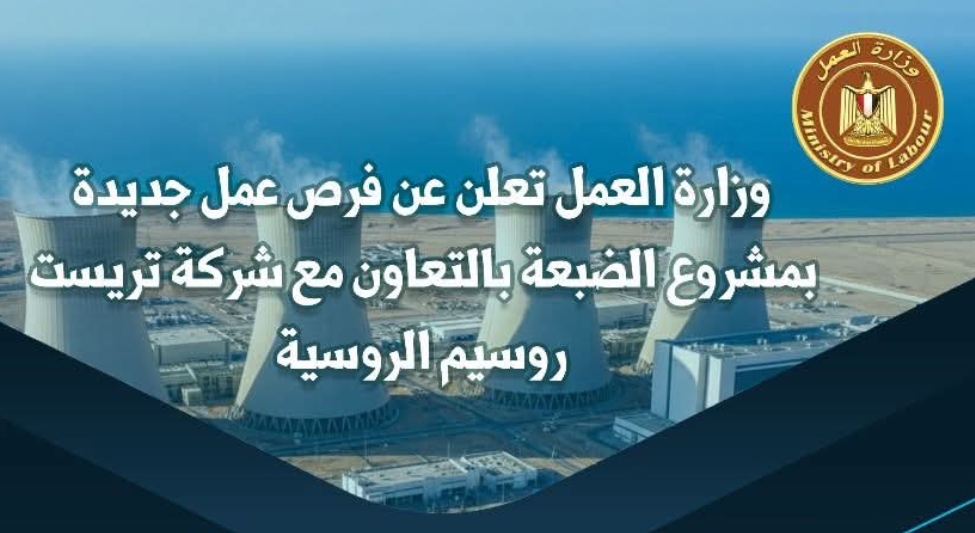 أعلنت وزارة العمل، عن إتاحة مجموعة من الوظائف الفنية الجديدة بالتعاون مع شركة تريست روسيم، إحدى الشركات المنفذة لأعمال الإنشاءات داخل محطة الضبعة النووية.